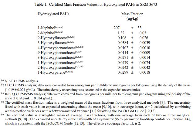 表 1 中提供了羥基化 PAH 的認(rèn)證質(zhì)量分?jǐn)?shù)值。 NIST 認(rèn)證值是 NIST 對其準(zhǔn)確性具有最高置信度的值,因?yàn)樗幸阎蚩梢傻牟淮_定性來源都已被調(diào)查或考慮在內(nèi)帳戶 [1]。認(rèn)證值基于 NIST、CDC 和魁北克國家公共健康研究所 (INSPQ) 獲得的結(jié)果的協(xié)議。