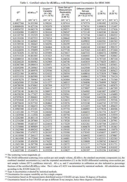 認證值是絕對 X 射線散射強度,以每單位玻璃碳樣品體積的 X 射線微分散射截面 dΣ/dΩ 與散射矢量的幅度 Q 的關系給出.圖 1 顯示了超小角 X 射線散射 (USAXS) 儀器的示意圖,該儀器是用于測量經認證的 X 射線散射強度值的主要儀器。經認證的 dΣ/dΩ 值列于表 1 中經認證的 Q 范圍為 0.008 ?–1 至 0.25 ?–1,并繪制在圖 2 中。 NIST 認證值是 NIST 對其準確性有最高置信度的值,因為所有已知或可疑的偏差來源都已被調查或考慮 [2]。認證值基于在環境條件下進行的測量。