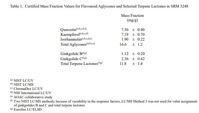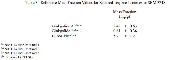 NIST SRM 3248銀杏片(標(biāo)準(zhǔn)品)NIST 參考值是未經(jīng)認(rèn)證的值,它是基于可用數(shù)據(jù)對真實值的最佳估計;但是,該值不符合 NIST 的認(rèn)證標(biāo)準(zhǔn) [1],并帶有相關(guān)的不確定性,這些不確定性可能僅反映測量再現(xiàn)性,可能不包括所有不確定性來源,或者可能反映多種分析方法之間缺乏足夠的統(tǒng)計一致性。表 3 中提供了其他萜內(nèi)酯的參考濃度值。表 4 中提供了砷、鎘和汞的參考值。