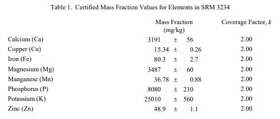 表 1 和表 2 提供了 SRM 3234 中元素和維生素的認證質量分數值,以干質量為基礎報告。NIST 認證值是 NIST 對其準確性有最高置信度的值因為所有已知或可疑的偏見來源都已被調查或考慮 [1]。價值分配分析由 NIST 和合作實驗室進行。認證值計算為 NIST 方法的平均值和合作實驗室提供的平均結果的中位數(在適當的情況下)。所有值在沒有加權的情況下合并。相關的不確定性以大約 95% 的置信水平表示 [2-4]。