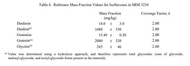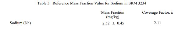 表 3 到表 6 提供了NIST SRM 3234豆粉(標準品) 中鈉、異黃酮、近似物、總膳食纖維、卡路里和氨基酸的參考質量分數值,以干質量為基礎報告。NIST 參考值是未經認證的值,它是基于可用數據對真實值的最佳估計;但是,該值不符合 NIST 認證標準 [1],并且提供的不確定度可能僅反映測量再現性,可能不包括所有不確定性來源,或者可能反映多種分析方法之間缺乏足夠的統計一致性。參考質量分數值來自 NIST 或合作實驗室報告的結果。