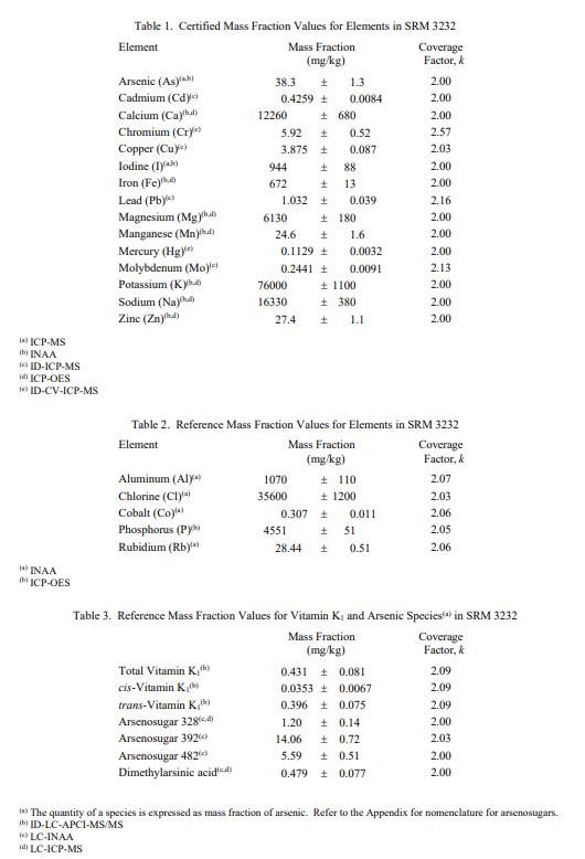 元素測定:SRM 3232 中元素質量分數的賦值基于 NIST 測量,使用電感耦合等離子體發射光譜法 (ICP-OES)、電感耦合等離子體質譜法 (ICP-MS)、同位素稀釋 ICP-MS (ID-ICP-MS)、同位素稀釋冷蒸氣生成ICP-MS (ID-CV-ICP-MS) 和儀器中子活化分析(INAA)。