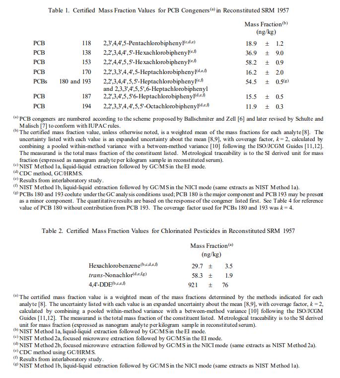 表 1、2 和 3 分別提供了選定 PCB 同系物、氯化農藥和 PBDE 同系物以及一種多溴聯苯同系物的認證值,以質量分數表示。 NIST 認證值是 NIST 對其準確性具有最高置信度的值,因為所有已知或可疑的偏差來源都已被調查或考慮在內 [1]。 PCB 同系物、氯化農藥和 PBDE 同系物的認證值基于 NIST 使用一種或多種分析技術獲得的結果的一致性,以及來自 CDC 和使用不同的分析技術進行實驗室間研究。數值是基于以質量分數為單位的重構血清報告的 [2]。