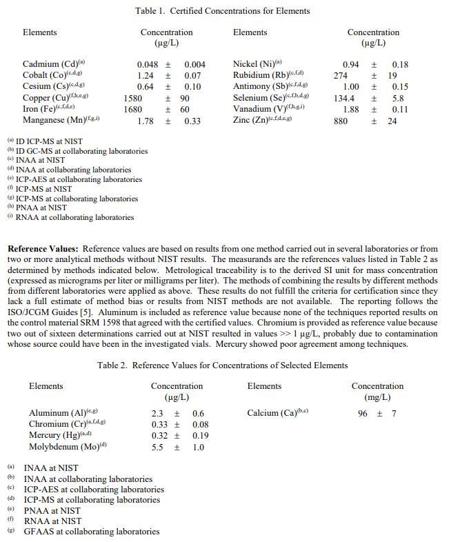 表1中提供了元素濃度的認證值。認證值基于NIST進行的主要分析技術的結果,或者NIST獲得的兩種或多種化學獨立分析技術的組合結果,以及合作專家實驗室[2]。NIST認證值是NIST對其準確性具有最高置信度的值,因為NIST已調查或說明了所有已知或可疑的偏差來源。