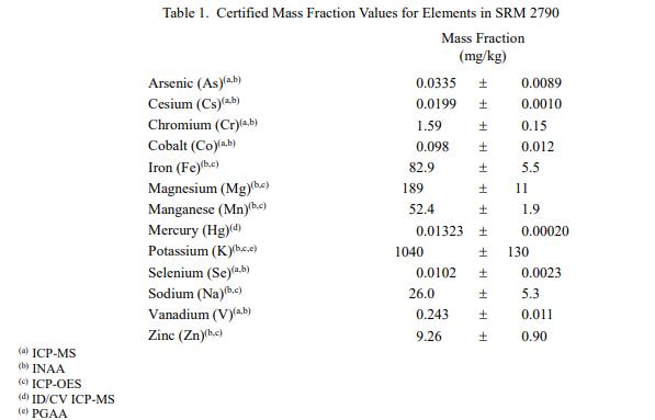 SRM 2790 中元素的認證質量分數值,以干質量為基礎報告,灰分分別在表 1 和表 2 中提供。 NIST 認證值是 NIST 對其準確性具有最高置信度的值,因為所有已知或可疑的偏差來源都已被調查或考慮在內 [1]。 NIST 進行了賦值分析。認證的質量分數值計算為 NIST 方法的平均值的平均值。相關的不確定性以大約 95% 的置信水平表示 [2-4]。