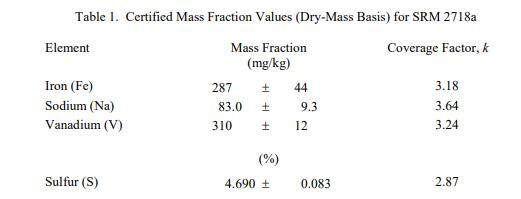 表 1 中提供了鐵、鈉、硫和釩的認證值,以基于干質量的質量分數 [1] 表示。NIST 認證值是 NIST 具有最高的值對其準確性的信心,因為所有已知或可疑的偏差來源都已被調查或考慮 [2]。認證值是對真實值的當前最佳估計。