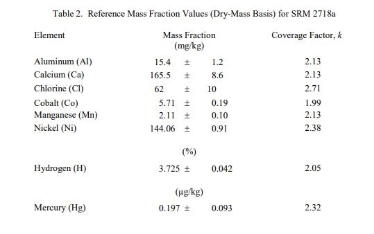 表 2 中提供了鋁、鈣、氯、鈷、氫、汞、錳和鎳的參考值,以基于干質量的質量分數 [1] 表示。參考值是對真實價值的最佳估計的非核證價值;但是,該值不符合 NIST 的認證標準,并且提供了相關的不確定性,該不確定性可能僅反映測量精度,可能不包括所有不確定性來源 [2]。