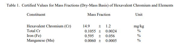 表 1 提供了 SRM 2700 中基于干質(zhì)量的六價(jià)鉻、總鉻、鐵和錳的認(rèn)證質(zhì)量分?jǐn)?shù)。認(rèn)證值基于經(jīng)過(guò)嚴(yán)格評(píng)估的獨(dú)立分析技術(shù)。 NIST 認(rèn)證值是 NIST 對(duì)其準(zhǔn)確性具有最高置信度的值,因?yàn)樗幸阎蚩梢傻钠顏?lái)源都已被調(diào)查或考慮在內(nèi) [1]。被測(cè)量是表 1 中報(bào)告的元素的質(zhì)量分?jǐn)?shù)。計(jì)量溯源性為質(zhì)量的 SI 單位,以質(zhì)量分?jǐn)?shù)表示。