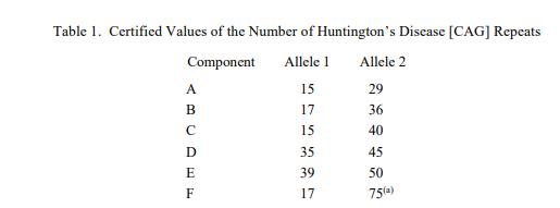 表 1 列出了每個成分的 [CAG] 重復次數的認證值。這些認證值是通過 Sanger 測序技術計算組成等位基因中 [CAG] 重復單元的數量來確定的,并通過片段分析(基因分型)確認。獨立的正向和反向測序和片段分析結果之間的完全一致提供了對規定整數計數的最高置信度。探索了其他技術,沒有理由懷疑這些結果。 NIST 認證值是 NIST 對其準確性有最高置信度的值,因為所有已知或可疑的偏差來源都已調查。這CAG 重復次數的認證值可追溯到 SI 計數單位 (1)。