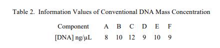 表 2 列出了 SRM 2393 組分的 DNA 質量濃度的信息值。這些值是使用 SRM 2372 人類 DNA 定量標準品中的組分 A 校準的五種定量聚合酶鏈式反應 (PCR) 方法的結果的平均值。在 hTERT 基因座處擴增的商業定量 PCR 方法的相對較高結果被排除在平均值之外,因為該基因座有時在細胞系 DNA 中過度表達 [4,5]。