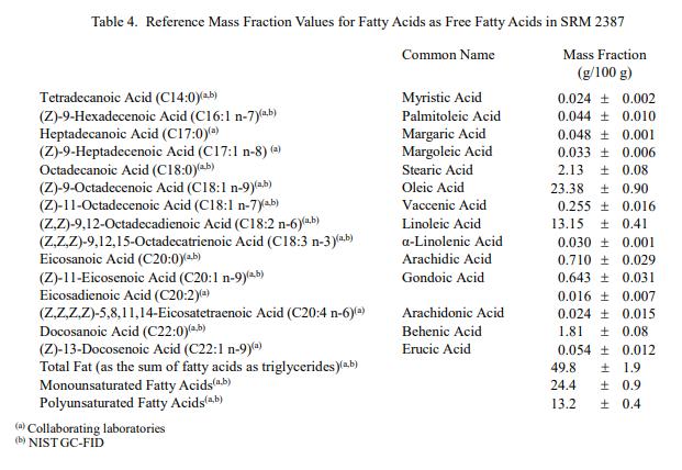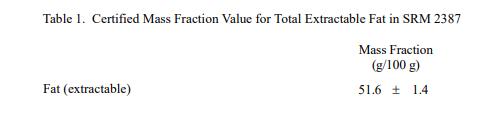 表 1 至表 3 中提供了 SRM 2387 中脂肪、元素和生育酚的認證質量分數值。NIST 認證值是 NIST 對其準確性有最高置信度的值,因為所有已知或懷疑偏差的來源已被考慮 [1]。價值分析分配由 NIST 和合作實驗室完成。該材料中的認證質量分數值計算為 NIST 方法的平均值和合作實驗室進行的測量的平均值(如果適用)。相關的不確定性以大約 95% 的置信水平表示 [2-4]。數值以質量分數單位 [5] 以原樣(非干質量)為基礎報告。