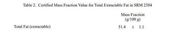 表 1 和表 2 中提供了 SRM 2384 中元素和脂肪的認證質(zhì)量分數(shù)值。NIST 認證值是 NIST 對其準確性的最高置信度值,因為所有已知或可疑的偏差來源已考慮[1]。進行了價值分配分析由 NIST 和合作實驗室提供。認證的質(zhì)量分數(shù)值計算為 NIST 方法的平均值和合作實驗室進行的平均測量值的中位數(shù)或平均值(如果適用)。相關(guān)的不確定性以大約 95% 的置信水平表示 [2,3]。數(shù)值以質(zhì)量分數(shù)單位 [4] 以原樣(非干質(zhì)量)為基礎(chǔ)報告。