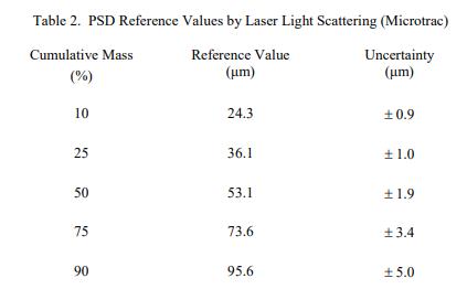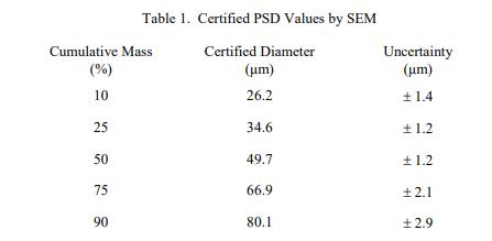 計量溯源性是長度的 SI 單位(以微米表示)。根據 ISO/JCGM 和 NIST 指南 [2] 計算的每個百分位數的不確定度是 95% 置信水平的擴展不確定度,其中包括由于測量不精確和材料可變性導致的不確定度。每個經認證的直徑及其擴展的不確定性定義了一個直徑范圍,相關百分位數預計至少有 95% 的樣品位于該直徑范圍內。