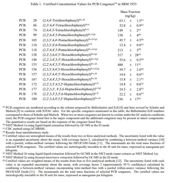 表 1、2 和 3 分別提供了 PCB 同系物、氯化農藥和 PBDE 同系物以及多溴聯苯同系物的濃度認證值,以質量分數表示。 NIST 認證值是 NIST 對其準確性具有最高置信度的值,因為所有已知或可疑的偏差來源都已被調查或考慮在內 [1]。經認證的pCB 同系物、氯化農藥和 PBDE 同系物的值基于 NIST 使用一種或多種分析技術獲得的結果與 CDC 和使用不同分析技術的實驗室間研究的額外結果的一致性。