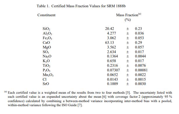 SRM 1888b 的 13 種成分的認證值在表 1 中報告為收到時的質量分數 [1]。 NIST 認證值是 NIST 對其準確性具有最高置信度的值,因為所有已知或可疑的偏差來源都已被調查或考慮在內 [2]。認證值是根據 NIST 和合作實驗室使用附錄 A 中列出的儀器和經典測試方法進行的分析結果對真實值的當前最佳估計。