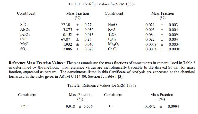 表 1 提供了 SRM 1886a 的認證值,以收到時的質量分數 [1] 表示。NIST 認證值是 NIST 對其準確度有最高置信度的值,因為所有已知或可疑的偏見來源都已被調查或考慮 [2]。這列出的認證值基于 NIST、Construction Technology Laboratories(1), Inc. (CTL, Skokie, IL) 和美國地質調查局 (USGS, Denver, CO) 使用 X 射線熒光光譜法進行的分析結果,原子吸收分光光度法、電感耦合等離子體發射光譜法和 ASTM C 114-00 液壓水泥化學分析標準測試方法 [3] 中給出的參考方法。在 NIST 使用 X 射線熒光光譜法進行均勻性測試。隨每個值列出的不確定性是擴展的不確定性,覆蓋因子為 2,根據 ISO/JCGM 指南 [5],通過將方法間方差 [4] 與匯總的方法內方差相結合來計算。