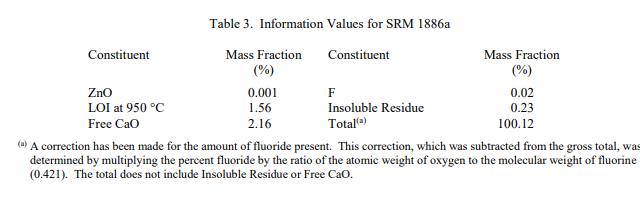 表 3 中提供了 ZnO、F、不溶性殘留物、燒失量 (LOI)、游離 CaO 和所有成分總和的信息值。這些是未經認證的值,沒有評估不確定性。