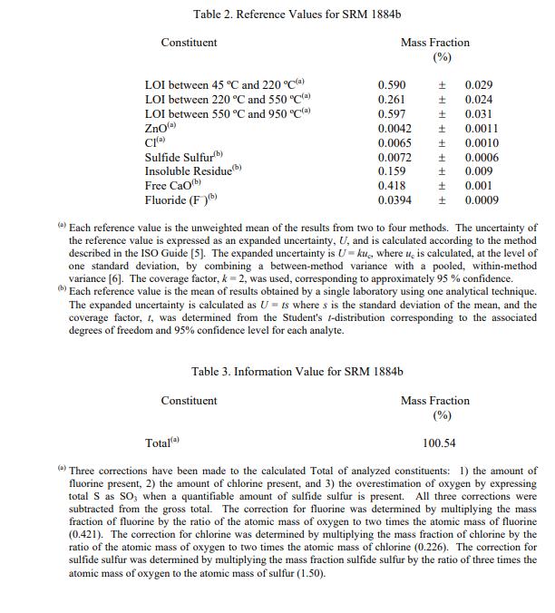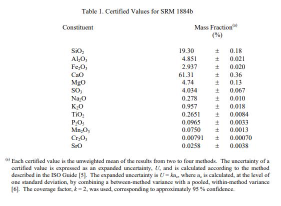 SRM 1884b 中 13 種成分的認證值在表 1 中報告為收到時的質量分數 [1]。 NIST 認證值是 NIST 對其準確性有最高置信度的值,因為所有已知或可疑的偏差來源都已被調查或考慮在內 [2]。認證值是根據 NIST 和合作實驗室使用附錄 A 中列出的儀器和經典測試方法進行的分析結果對真實值的當前最佳估計。