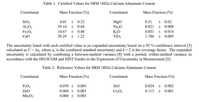 表 1 中提供了八種元素的認(rèn)證值,以氧化物形式表示為質(zhì)量分?jǐn)?shù) [1],在收到的基礎(chǔ)上。NIST 認(rèn)證值是 NIST 對(duì)其最有信心的值。準(zhǔn)確性,因?yàn)樗幸阎蚩梢傻钠顏碓炊家驯徽{(diào)查或考慮帳戶。列出的認(rèn)證值基于 NIST 和 Construction Technology Laboratories, Inc. (CTL) 使用 X 射線熒光光譜法、原子吸收光譜法和 ASTM C 114-97 標(biāo)準(zhǔn)測試方法中給出的參考方法進(jìn)行的分析結(jié)果液壓化學(xué)分析水泥 [2]。使用 X 射線熒光光譜法進(jìn)行均勻性測試。