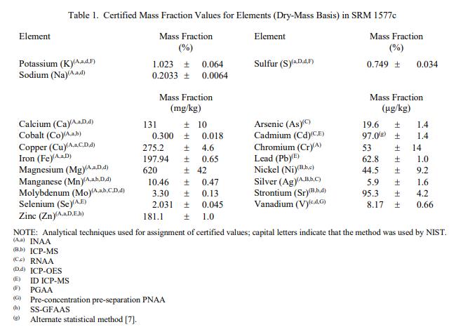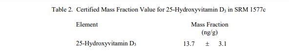 表 1 中提供了元素的認(rèn)證質(zhì)量分?jǐn)?shù)值。表 2 中提供了 25-羥基維生素. D3 的認(rèn)證質(zhì)量分?jǐn)?shù)值。元素的認(rèn)證值基于所執(zhí)行的主要分析技術(shù)的結(jié)果在 NIST 或在 NIST 和合作專家實(shí)驗(yàn)室獲得的兩種或多種化學(xué)獨(dú)立分析技術(shù)的組合結(jié)果 [1]。 25-羥基維生素 .D3 的認(rèn)證值基于 NIST 和合作專家實(shí)驗(yàn)室的綜合結(jié)果。 NIST 認(rèn)證值是 NIST 對其準(zhǔn)確性具有最高置信度的值,因?yàn)樗幸阎蚩梢傻钠顏碓炊家驯徽{(diào)查或考慮在內(nèi) [1]。