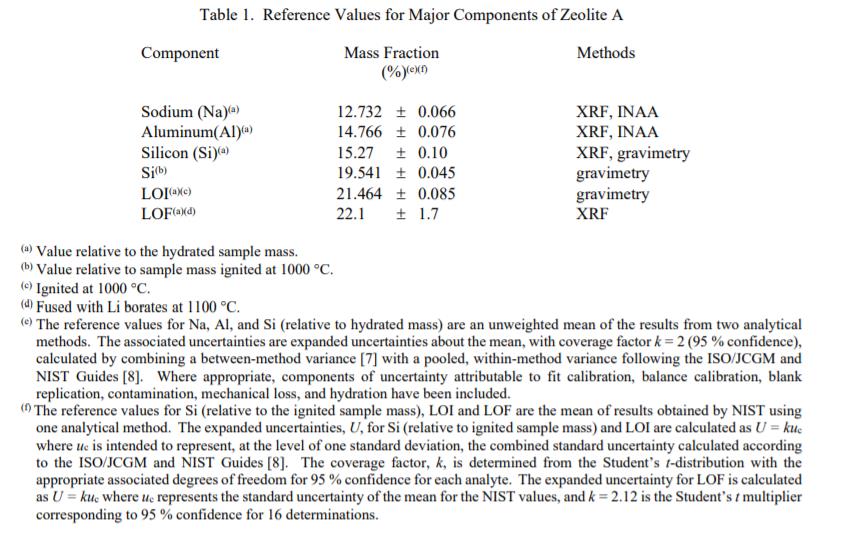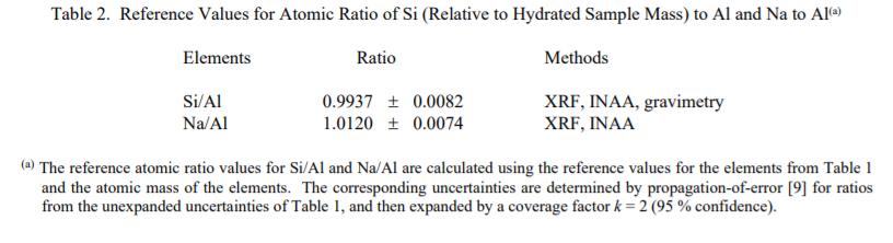 信息值是 RM 用戶可能感興趣和使用的未經(jīng)認證的值,但沒有足夠的信息來評估與值相關的不確定性 [1]。表 4 中提供了由核磁共振 (NMR) 確定的 Si/Al 比的信息值。表 5 中提供了組成氧化物和液態(tài)水和元素的形成焓的信息值。 晶胞參數(shù)的信息值表 6 和表 7 中提供了水合和脫水沸石 A;用于原子的分數(shù)坐標、位置占用、各向同性熱參數(shù)和位置多重性的信息值